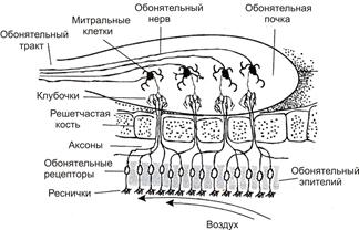 Обонятельный анализатор высших животных и людей – специализированная система, обеспечивающая восприятие различных пахучих веществ, анализ и обработку возбуждений, которые возникают от периферии до центральной нервной системы. Состоит обонятельный анализатор из обонятельных рецепторных клеток (нейронов), которые расположены в слизистом слое толщиной около 60 мкм (рис. 7.12). Рецепторный