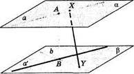 Скрещивающиеся прямые аи Ъ лежат в параллельных плоскостях. Обозначим их соответственно а, р. Пусть проекция а1 прямой а на плоскости р пересекает прямую Ъ в некоторой точке В. Точка В является проекцией на Р некоторой точки А е а. Отрезок АВ будет общим перпендикуляром плоскостей а и р, а поэтому и общим перпендикуляром прямых а и 6. Если теперь возьмем любой другой отрезок XY (Xea, Yeb), то |АВ|<|ХУ|. Поэтому расстояние между скрещивающимися прямыми связано с их общим перпендикуляром. Определение. Расстоянием между скрещивающимися прямыми называется длина их общего перпендикуляра. Вопросы и задания 1. Как можно найти расстояние между параллельными плоскостями? 2. Что такое расстояние между плоскостью и параллельной ей прямой? 3. Что такое общий перпендикуляр скрещивающихся прямых? 4. Как можно найти расстояние между скрещивающимися прямыми? Задачи А 128. Расстояние между двумя параллельными плоскостями равно h. Отрезок длины а своими концами упирается в эти плоскости. Найдите проекцию отрезка на каждую из плоскостей.