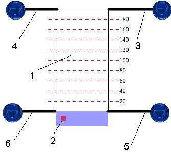 Рис. 8. Схема установки для разделения ионов меди между двумя несмешивающимися жидкостями: 1 – емкость для разделения (экстрактор), 2 – кнопка включения магнитной мешалки, трубки для подачи/слива: 3 – водного раствора содержащего ионы меди, 4 – органической фазы, 5 – на отбор проб для титрования, 6 – растворов в отстойник
