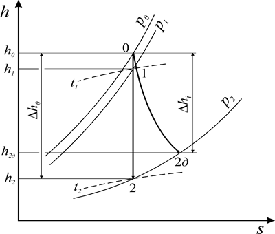 что приводит к увеличению значения энтальпии пара на выходе из сопла в действительном процессе истечения по сравнению с обратимым адиабатным процессом