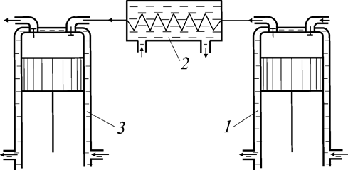 При высоких степенях сжатия газа в одноступенчатом компрессоре в конце процесса температура газа достигает весьма высокого значения, что нежелательно, в частности, из-за опасности воспламенения масла в системе смазки. Поэтому для получения газа высокого давления используют многоступенчатые компрессоры, представляющие собой несколько последовательно соединенных одноступенчатых компрессоров. Между отдельными ступенями устанавливают теплообменники, обеспечивающие охлаждение газа, сжатого в предыдущей ступени (рис. 31).