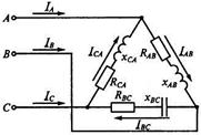 1.Каковы будут сопротивления RCA и xCA на рис., если IAB=8A, IBC=6A, ICA=10A; RAB=5Ом, RBC=10Ом, xAB=8Ом, xBC=7Ом; активная мощность потребителя Р=2680 Вт, а реактивная Q=1760 вар?