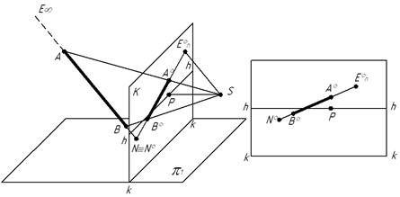 Приклад 1. Пряма загального положення (висхідна) довільно розташована відносно предметної і картинної площин. Розв’язання. Для побудови перспективи прямої досить побудувати перспективи точок, розташованих на цій прямій, наприклад, точки початку прямої і нескінченно віддаленої точки. Точка початку прямої буде точкою зустрічі прямої з картиною. На рис.3.2 дані висхідна пряма АВ, точка зору S, картина К і предметна площина p1. Приступаючи до побудови перспективи А°В° прямої АВ, необхідно продовжити пряму до перетину з картиною в точці N. Перспектива Nº початку прямої N збігається з самою точкою. Потім будується перспектива Епº безконечно віддаленої точки Е∞ прямої АВ. Точка Епº – точка сходу перспективи А°В° прямої АВ та прямих, паралельних їй. З’єднавши перспективи Nº і Епº (точки початку прямої безконечно віддаленої точки), одержують перспективу напрямку прямої. Слід підкреслити, що точка сходу Епº перспективи будь-якої прямої визначається точкою перетину проекціюючого променя, що йде з точки S паралельно даній прямій, з картиною.