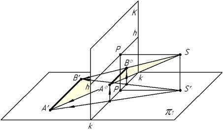 Приклад 3. Горизонтальна пряма, паралельна площинам p1 і К. Розв’язання. На рис.3.4 в перспективній системі дана пряма А'В', паралельна p1 і К. Через точки А' і В' проводять з точки S проекціюючий промінь або проекціюючу площину. Лінія перетину АºВº цієї площини з картиною буде перспективою шуканої прямої А'В'. Перспектива горизонтальних прямих, паралельних основі картини, розташовується завжди паралельно горизонту і не має з ним точки сходу.