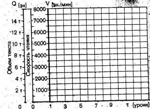 Запомним, что освоение метода быстрого чтения глубоко индивидуально. В нашей практике не было еще случая, чтобы в классе все учащиеся одинаково успешно осваивали упражнения и теоретический курс. Каждый сам выбирает для себя темп и свою стратегию наращивания скорости чтения. Отдельные упражнения и методика в целом подсказывают ряд принципов решения этой задачи. Прав был Н. А. Рубакин, когда писал, что лучший метод чтения — это тот, который читатель сам для себя выбирает. Таким образом, задача обучения — сформировать новые программы умственных действий. И наконец, третье обязательное условие для успешного овладения методом быстрого чтения — постепенность наращивания скорости и приобретения навыков. Это означает, что необходимо следовать таким известным принципам: от легкого к трудному, от известного к неизвестному. Переходить к следующему упражнению нужно только тогда, когда устойчиво освоены предыдущие. Мы рекомендуем в процессе занятий вести дневники самоанализа, а числовые результаты роста скорости чтения контрольных текстов фиксировать на специальном графике, образец которого приведен на рис. 28. Подбор всех упражнений и их последовательность выполнения обеспечивают постепенное освоение новых навыков умственной деятельности. В этом — методическая идея книги. Урок первый. Определение начальной скорости чтения. Скорость чтения определяют формулой: