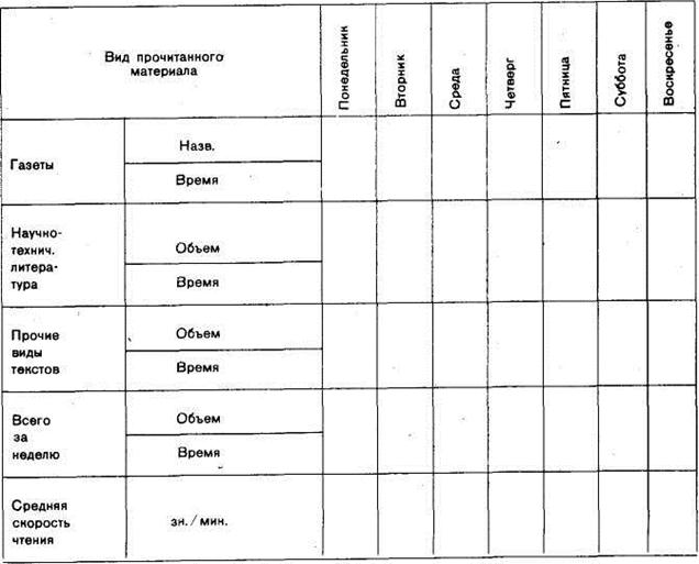 В процессе обучения полезно вести регулярный учет объема читаемого текста и бюджета времени, затраченного на чтение. Для этого можно воспользоваться приведенной формой табл. 4. Урок второй. Как вы читаете? Изучив основные особенности процесса чтения и недостатки его традиционного метода, полезно провести анализ своего чтения. Чтение, даже самое несовершенное, в значительной степени процесс непроизвольный, интуитивный. Чтобы провести анализ персонального чтения и подметить его недостатки, предлагаем ответить на 10 вопросов приведенной здесь анкеты, причем ответы оцениваются самим читателем соответствующим числом баллов. Число баллов 1. Всегда ли вы, начиная чтение, имеете четкую цель и мотив? Всегда очень четкую и чтение мотивировано......................................... 10 Всегда приблизительную и без мотива...................................................... 6 Иногда............................................................................................................ 4 Лишь изредка................................................................................................ 2 Никогда.......................................................................................................... 0 2. Меняете ли вы скорость чтения на протяжении одной статьи? Постоянно меняю....................................................................................... 10 Иногда............................................................................................................ 6 Скорость определяю перед началом чтения заранее …………………...4 Всегда читаю со средней скоростью...........................................................2 Всегда читаю очень медленно.....................................................................0 3. Удается ли целиком сосредоточиться на тексте? Удается всегда..............................................................................................10 В основном удается.......................................................................................6 Лишь в случае, если материал очень интересный....................................4 В редких случаях...........................................................................................2 Не удается.......................................................................................................0 4. Можете ли вы быстро понять структуру читаемого текста? Построение текста чувствую всегда..........................................................10 Понять, какие разделы наиболее важны, мне удается быстро.................6 После прочтения небольшой части уже представляю себе структуру...4 Разбираюсь в структуре только после того, как прочитаю весь текст...2 На структуру не обращаю внимания...........................................................0 5. Можете ли вы понять сразу смысл целого предложения или хотя бы части его? Могу всегда..................................................................................................10 Могу, если текст легкий................................................................................6 Иногда.............................................................................................................4 Изредка...........................................................................................................2 Не могу...........................................................................................................0 6. Возвращаетесь ли вы повторным взглядом к уже прочитанному тексту? Никогда.........................................................................................................10 Если есть незнакомые места, то возвращаюсь...........................................6 Изредка возвращаюсь из-за непонимания слов.........................................4 Иногда, если не понимаю смысла текста....................................................2 Возвращаюсь часто по различным поводам...............................................0 7. Водите ли вы по строке пальцем либо карандашом или следите за текстом движением головы? Голова и руки всегда без движения...........................................................10 Иногда двигаю головой.................................................................................6 При чтении важных мест вожу пальцем по