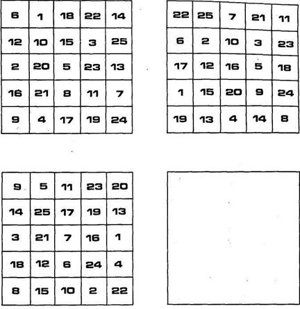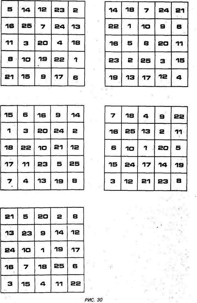 Урок восьмой. Тренировка внимания. Быстрое чтение требует повышенного внимания. Особенность предложенных здесь упражнений в том, что они требуют большого периода времени для тренировок. Устойчивый навык сосредоточения формируется медленно. Одно из эффективных упражнений для тренировки внимания — созерцание точки — мы уже рассмотрели ранее. Ниже предлагаются дополнительные упражнения для тренировки внимания. УПРАЖНЕНИЯ ДЛЯ РАЗВИТИЯ УСТОЙЧИВОГО ВНИМАНИЯ Упражнение 1. Возьмите небольшой предмет (монету, обручальное кольцо или перстень), рассмотрите его повнимательней в течение 1—1,5 мин. Уберите предмет и опишите его (письменно). Вы должны описать предмет очень подробно. Затем посмотрите на него снова, выявите ошибки и дополните описание. Постепенно переходите к более сложным предметам (часы, авторучка, настольная лампа) и затем к картинам знаменитых художников. Обязательно сверяйте описанное вами изображение с оригиналом. Стремитесь до тонкостей до малейших подробностей описать предмет. При тренировках на картинах художников развивайте в себе чувство образного мышления по схеме: от ощущений к настроению и от настроения к состоянию. Упражнение 2. Здесь используются таблицы Шульте, с которыми вы уже тренировались. Дополнительно к комплекту таблиц нужно сделать три шаблона-маски (см. рис. 32). Это лист плотной бумаги, который по размеру совпадает с таблицей Шульте и в котором произвольно вырезаны окошки (соответственно пять, семь, девять). Шаблон-маску накладывают на таблицу Шульте — в окошках теперь будут видны пять, семь или девять цифр очередной таблицы в зависимости от типа шаблона. Наложив шаблон на таблицу на 5 — 10 с, всмотритесь в цифры в вырезах шаблона, затем, закрыв их, запишите по памяти и проверьте правильность ответа. Начинать тренировки следует с шаблоном, имеющим пять вырезов, затем семь и, наконец, перейти к тренировкам с шаблоном, имеющим девять вырезов. Постепенно сокращайте время наблюдения и доведите его до 5 с.