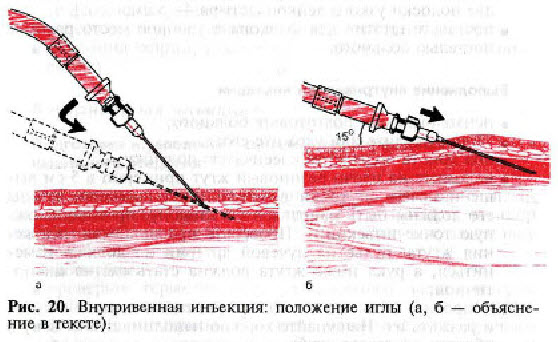 Внутривенная инъекция: положение иглы (а, б - объяснение в тексте).
