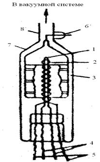 Манометрическая лампа – ЛМ-2 Ионизационная манометрическая лампа ЛМ-2 похожа на обычную трех электродную лампу и не превышает по размерам среднюю приемно-усилительную. Внутри баллона 7 (рисунок 8.1) размещены три электрода: катод – 1, анод-сетка – 2, и никелевый цилиндрический коллектор – 3 (собирает положительно заряженные ионы). Вывод коллектора осуществляется через молибденовый ввод – 6 в верхней части баллона, что улучшает изоляцию между коллектором и другими электродами. Молибденовые выводы 4 от катода 1 и 5 от сетки-анода – 2 делаются через катодную ножку. Баллон 7 изготовляют из стекла типа ЗС-5 (молибденовое стекло у него коэффициент объемного расширения такой же, как коэффициент объемного расширения у молибдена). Манометрическая лампа ЛМ-2 напаивается на вакуумный пост через патрубок 8. На рисунке 8.2 приведена схема включения ЛМ-2 к вакуумному посту или к прибору.