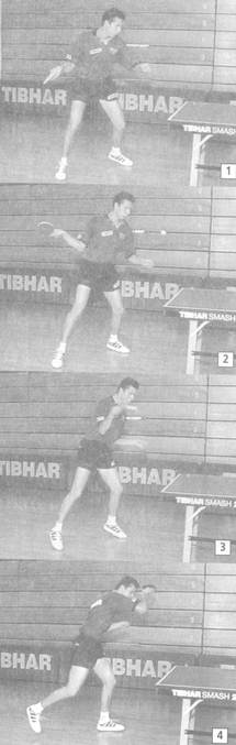 Кроме всего вышесказанного, отметим, что существует несколько разно- видностей удара по высокому мячу. Одна из них - удар по поднимающемуся мячу, не достигшему максимальной высоты после отскока. В этом случае у со- перника практически не остается времени на отход в защиту, поскольку мяч возвращается очень быстро. Слабая сторона такого удара заключается в том, что и у самого игрока остается очень мало времени на принятие решения и велик риск ошибки при выходе на исходную позицию для приема приходя- щего мяча. Такой вариант удара по высокому мячу обычно применяется в том случае, если мяч отскакивает от стола в непосредственной близости от сетки.