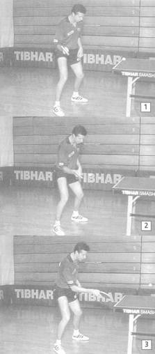 V.9.3.2. Замах При замахе рука сгибается в локте, локоть расположен сбоку от корпуса на V.9.3.3. Удар Удар производится за счет движения предплечья и кисти, без участия плеча; V.9.3.4. Точка удара Удобнее всего бить по мячу в высшей точке после его отскока от стола. Од- V.9.3.5. Завершение удара Игровое движение завершается над столом или немного выше уровня по- Срезку разучивают на первой стадии тренировочного процесса. Сначала Спортсмен-правша должен уметь принимать мячи, идущие вправо, при по-
