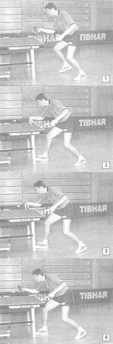 1) Игрок-правша приближается к столу 2) Непосредственно перед ударом ракетка 3) После контакта с мячом ракетка уходит - Удар выполняется исключительно от запястья. При ударе не удастся по- - Движение заканчивается слишком большим поворотом запястья в на- - Удар производится по падающему мячу.