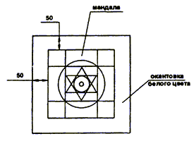 Мандала. На цветном вкладыше найдите медитативную диаграмму «Мандала» — инструмент для медитации. Теперь возьмите квадрат из белой плотной бумаги (ватмана) или картона, наклейте на него мандалу, так чтобы по периметру оказалась белая окантовка шириной 50 мм (5 см) (см.рис.2). Ваш основной инструмент для медитации готов к работе.