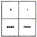 Подготовка. 1. Возьмите окно мнемониста, с которым вы работали в предыдущем уроке. 2. Возьмите изготовленные вами в предыдущем уроке прописные буквы А, М, П для составления из них слов МАМА, ПАПА. Закрепите слово МАМА в матричной ячейке № 3, слово ПАПА в матричной ячейке № 4. Теперь ваше окно примет вид в соответствии с рис.18. 3. Разместите окно мнемониста вертикально на расстоянии в соответствии со своим типом зрения так, чтобы обеспечить четкую видимость элементов. 4. Осветите окно ярким светом. Свет должен исходить из-за вашей головы, сзади, сверху. 5. Примите удобную для себя позу. Сидеть следует прямо. Не наклоняйте голову влево, вправо или вперед и не запрокидывайте ее назад, взгляд должен быть перпендикулярен полю окна. Порядок реализации. Смотреть на освещенное поле окна с закрепленными в нем элементами, не отрывая взгляда, в течение 1 мин. Закрыть глаза. Перед внутренним взором возникнет окно мнемониста.