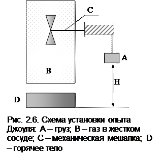 Изменение состояния газа в сосуде (например, ориентируясь на температуру и давление) можно осуществить двумя способами: механическим – путем вращения мешалки, и тепловым – нагревая газ с помощью тела D. В обоих случаях будет происходить изменение внутренней энергии газа. Джоуль добился одинакового изменения состояния газа механическим и тепловым взаимодествиями газа с внешней средой, т.е. в начале и в конце каждого энергетического взаимодействия параметры газа были одинаковы, например P1 и t1, P2 и t2. Поскольку одинаковы начальные и конечные состояния газа в обоих опытах, то одинаково и изменение внутренней энергии газа в этих опытах. Исходя из этого, можно записать: U2 - U1 = -L' = mgH, U2 - U1 = Q, -L' = Q. (2.28) В соответствии с выражением (2.28) получили эквивалентность механической работы, произведенной над газом, и теплоты, подведенной к газу. Единицы измерения теплоты и механической работы расширения в СИ одинаковы – джоуль (Дж), поэтому в данной системе единиц выражение первого закона термодинамики не требует ввода эквивалента между единицами теплоты и работы, как это была в XXIX веке.
