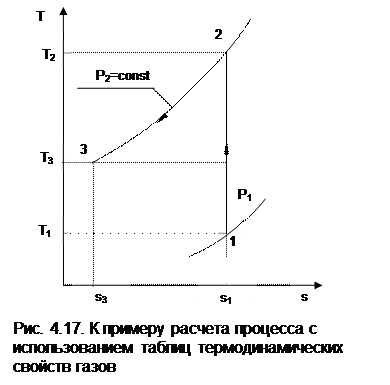 которое уменьшит абсолютное значение энтропии s1, но не скажется на величине изменения энтропии s2-s1. То есть значение температуры, принятое для начала отсчета абсолютной энтропии, не обязательно должно соответствовать базовой температуре То, принятой для расчета табличных величин sо. Также произволен и выбор значения Ро для расчета абсолютного значения энтропии. Величины cp, cv, u, h, so, po, qo, рассчитанные по формулам (4.32) – (4.45) для различных газов, сводятся в специальные таблицы [12] термодинамических свойств газов. В этих таблицах приводятся величины cp, cv, u, h, so, po, qo – в зависимости от температуры. Для расчета адиабатного процесса можно пользоваться всеми приведенными в таблице величинами. Для расчетов других процессов можно пользоваться только величинами cp, cv, u, h, so как функциями от температуры. Приведем пример использования этих таблиц для расчетов процессов газов, подчиняющихся уравнению Pv=RT. Пусть требуется рассчитать обратимый адиабатный процесс сжатия воздуха от состояния Р1=1 бар и t1=17 оС до давления Р2=10 бар, а затем рассчитать количество теплоты и изменение энтропии при охлаждении воздуха при постоянном давлении Р2=const от t2 до t3=20 оС (рис.4.17). Решение По таблицам термодинамических свойств воздуха [9, 12] определяем p01 по известной температуре t1=17 oC. Определив p01=1,2339, рассчитываем p02 по известному отношению давлений адиабатного процесса: