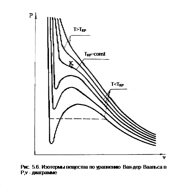 Величины a и b могут определяться экспериментально, но можно их и рассчитать. По расчетам получается, что они зависят от параметров критической точки газа, поэтому газ, подчиняющийся уравнению (5.1), называют ван-дер-ваальсовским газом. Изотермы Ван-дер-Ваальса в Р,v- диаграмме изображены на рис. 5.6. Сверхкритические изотермы качественно соответствуют изотермам реального газа. Докритические изотермы вместо горизонтального участка, характеризующего фазовый переход жидкость-пар, имеют волнообразный участок. Как показывают расчеты, попытки применения этого уравнения для описания областей, где вещество обладает резко выраженными свойствами реального газа (вблизи линии насыщения и околокритическая область), и тем более области жидкости, приводят к большим отклонениям от реальных значений параметров веществ. Поэтому практическое применение уравнение Ван-дер-Ваальса может найти только в ограниченной области состояний реальных газов [1, 2]. Ценность этого уравнения заключается в возможности качественной оценки и наглядной иллюстрации влияния простейших признаков реального газа на его термодинамические свойства. В целях усовершенствования уравнения Ван-дер-Ваальса в него вводились поправки. В результате учеными был получен ряд новых уравнений состояния реальных газов. Некоторые из них довольно точно описывали экспериментальные данные и были использованы для составления таблиц термодинамических свойств ряда веществ. Значительный шаг в направлении создания уравнения состояния реального газа был сделан американским физиком Дж. Майером и советским математиком Н.Н.Боголюбовым в 1937–48 гг. [10]. Независимо друг от друга они методом статистической физики показали, что в наиболее общем виде уравнение реального газа выглядит следующим образом: