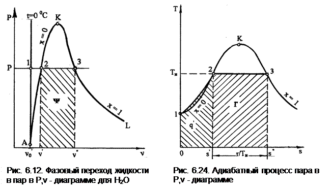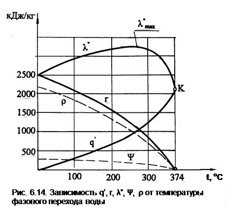 В фазовых диаграммах Р,v- и T,s cостояния сухого насыщенного пара определяются точками правой пограничной кривой КЛ на линии х=1 (рис. 6.12 и 6.13). Процесс 23 фазового перехода жидкости от состояния насыщения в сухой насыщенный пар является изобарно-изотермическим, т.е. здесь изобара совпадает с изотермой насыщения воды. Рассмотрим методику определения калорических параметров сухого насыщенного пара. Теплота, затраченная на превращение 1 кг жидкости в состоянии насыщения (кипения) в сухой насыщенный пар при постоянном давлении (температуре), называется удельной теплотой парообразования и обозначается буквой r, она может быть определена экспериментально. Все параметры сухого насыщенного пара отмечаются двумя штрихами (v", h", s" и т.д.). Исходя из первого закона термодинамики для процесса парообразования можно записать: r = u"- u' + Р(v"- v') = h"- h'. (6.9) В процессе парообразования температура не изменяется, следовательно, разность внутренних энергий u" - u' соответствует только изменению потенциальной ее составляющей или, как ее называют, работе дисгрегации (разъединения молекул), т.е. собственно работе перевода жидкости в пар. Она называется внутренней теплотой парообразования и обозначается буквой r: r = u" - u'. (6.10) Работа изменения объема при парообразовании называется внешней теплотой парообразования и обозначается буквой Y: Y = Р(v" - v'). (6.11) В диаграмме Р,v она представлена площадью под горизонталью 23 (рис.6.12). Использовав введенные обозначения, уравнение (6.9) можно представить в виде r = r + Y. (6.12) При критическом давлении все члены равенства (6.12) равны нулю: r=r=j=0. В изобарном процессе 123 (см. рис.6.13) затрачивается теплота для нагрева жидкости от t=0 оС до состояния сухого насыщенного пара, называющаяся полной теплотой сухого насыщенного пара: l" = q' + r = q' + r + Y = h" - Рvo'. (6.13) Эта теплота и все ее слагаемые зависят от давления или от температуры насыщения. Зависимость этих величин от температуры насыщения представлена на рис. 6.14. Теплоту парообразования можно выразить через разницу энтальпий (6.9). Следовательно, энтальпию сухого насыщенного пара можно определить как h" = h' + r = q' + Рvo' + r = l" + Рvo'. (6.14) Из рис. 6.14 видно, что l" имеет максимум. Поскольку Рvo' несоизмеримо мала по сравнению с l", то и h" имеет максимум. При этом важно отметить, что максимум энтальпии сухого насыщенного пара h " находится при температуре меньшей, чем у критической точки. Внутренняя энергия сухого насыщенного пара определяется из соотношения u" = h" - Рv". (6.15) Изменение энтропии при изобарно-изотермическом процессе парообразования 23 может быть определено как