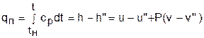 Получение перегретого пара можно рассмотреть на примере энергетического парогенератора. В парогенераторах для перегрева пара используют пароперегреватели, представляющие собой трубную поверхность теплообмена (рис.6.17). Внутри труб пароперегревателя проходит пар, поступающий из котла в виде влажного пара. Поверхность труб омывается горячими продуктами сгорания топлива (на ТЭС) или горячей водой или паром большего давления (на АЭС). Не учитывая незначительного падения давления, вызванного гидравлическим сопротивлением в трубах, процесс перегрева пара в пароперегревателе можно считать изобарным. Рассмотрим методику определения калорических параметров перегретого пара. В соответствии с первым законом термодинамики теплота при перегреве пара затрачивается на изменение его внутренней энергии и на работу изменения объема. При этом теплота, идущая на изменение внутренней энергии пара, расходуется на изменение кинетической энергии молекул, что проявляется в изменении температуры, и на преодоление сил взаимодействия между молекулами – работу дисгрегации (разделения частиц). Работа изменения объема расходуется на преодоление внешнего давления и при изобарном процессе определяется как Р(v - v"). Теплота, необходимая для перевода 1 кг сухого насыщенного пара в перегретый пар с температурой t при изобарном ее нагревании, называется теплотой перегрева qп (рис. 6.18) и может быть определена как