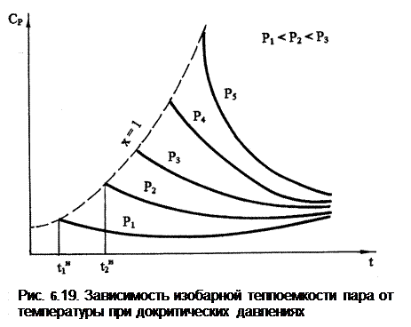 Анализ представленных на графике опытных данных при Р<Ркр приводит к выводу: 1) при постоянном давлении с повышением температуры от температуры насыщения изобарная теплоемкость сначала уменьшается, проходит через минимум, а затем медленно возрастает; 2) при одной и той же температуре cp тем больше, чем выше давление;