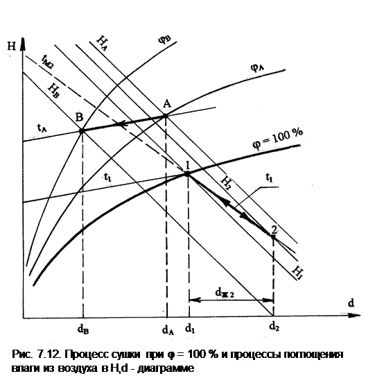 Рассмотрим изобарный процесс влажного воздуха, идущий при контакте его с объектом, содержащим воду и имеющим одинаковую с воздухом температуру, т.е. при отсутствии теплообмена между ними. К такому процессу относится процесс сушки для материала, содержащего воду. В этом процессе воздух используется в качестве сушильного агента. Поскольку воздух контактирует с материалами, содержащими воду, его влагосодержание может увеличиваться. Увеличение влагосодержания воздуха может происходить за счет испарения воздухом воды и за счет механического уноса им капелек жидкости. Рассмотрим сначала случай, когда увеличение влагосодержания воздуха происходит только за счет испарения воды (процесс 23, рис.7.11). В этом случае относительная влажность воздуха в начале процесса должна быть меньше 100 %. Теплота, идущая на испарение воды, берется из воздуха и передается испаряемой воде, поступающей в воздух. В результате испарения воды воздух охлаждается, температура его уменьшается, а испаренная вода в виде пара уносится потоком воздуха, увеличивая его влагосодержание на величину dисп=d3-d2. За счет увеличения влагосодержания (d3>d2) возрастает и парциальное давление водяного пара (Рп3>Рп2) в этом процессе. Однако энтальпия влажного воздуха при этом остается неизменной (Н2=Н3), поскольку внешнего подвода (отвода) теплоты не было, а просто произошло перераспределение энергии между воздухом и добавившимися к нему водяными парами. За счет снижения температуры воздуха его составляющая по сухому воздуху в энтальпии влажного воздуха уменьшилась, а составляющая энтальпии водяных паров увеличилась. Для нахождения конечных характеристик воздуха такого процесса достаточно замерить его температуру t3 и на пересечении этой изотермы с изоэнтальпой H2=const по H,d- диаграмме определить конечную точку процесса 3. В случае наличия потерь теплоты в окружающую среду в аналогичном процессе сушки (процесс 23') энтальпия воздуха будет уменьшаться (H3'<H2). Для определения конечного состояния воздуха по H,d- диаграмме в этом случае необходимо кроме температуры t3 знать второй параметр (температуру мокрого термометра, относительную влажность, влагосодержание). В случае если процесс сушки осуществляется воздухом, имеющим 100 % - ную относительную влажность, его влагосодержание может увеличиваться только за счет механического уноса потоком воздуха капелек воды. Этот процесс в H,d- диаграмме будет идти в области тумана по изотерме (рис.7.12, процесс 12), поскольку при отсутствии испарения воды температура воздуха изменяться не будет. Энтальпия воздуха в конце такого процесса будет больше, чем энтальпия воздуха в начале процесса (H2>H1). Такое возрастание энтальпии обусловлено появлением слагаемого 4,187tdж/1000 в расчетном выражении энтальпии влажного воздуха в области тумана. Поскольку унос капель воды в нашем процессе приводит к увеличению dж от нуля до dж2, то, несмотря на постоянство температуры воздуха в процессе 12, его энтальпия будет возрастать. Только в случае наличия потерь теплоты во внешнюю среду данный процесс может идти со снижением температуры и энтальпии. Для определения по H,d- диаграмме конечного состояния воздуха в этом случае необходимо определить опытным путем его температуру и количество унесенной влаги в пересчете на 1 кг сухого воздуха (dж2=d2-d1). Процесс поглощения влаги из