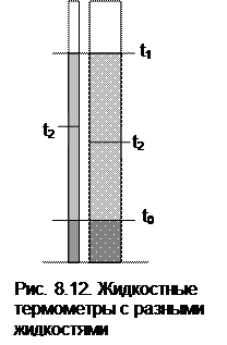Теорема Нернста – третье начало термодинамики Температура относится к интенсивным термодинамическим параметрам состояния тел. Определение ее осуществляется через экстенсивные свойства тел, например через изменение объема жидкости в бытовом термометре. Для таких термометров могут быть приняты различные равномерные температурные шкалы, в которых могут быть приняты одинаковыми значения температур только в двух опорных точках. При всех других значениях температур различные термометры будут давать различные показания. Например, возьмем два жидкостных термометра с различными свойствами жидкостей в них (рис.8.12). В цилиндрических столбиках этих термометров можно добиться одинакового уровня при температуре t0 путем их наполнения при данной температуре, при этом можно подобрать диаметры цилиндров таким образом, чтобы при температуре t1 их уровни тоже были одинаковыми. Однако в этих цилиндрах при температурах, отличных от t0 и t1, уровни жидкостей совпадать не будут, из-за различных изменений объемов жидкостей с различными термодинамическими свойствами.