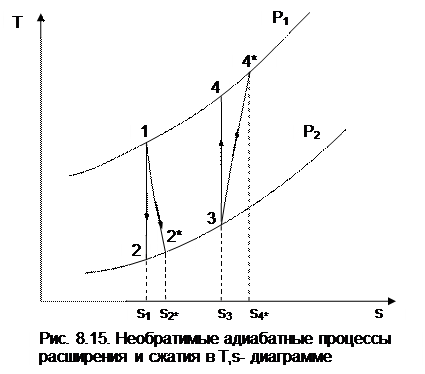 Используя эти выражения, можно дать следующую формулировку второго закона термодинамики для тела – необратимость термодинамического процесса для тела приводит к увеличению изменения энтропии необратимого процесса по сравнению с изменением энтропии аналогичного обратимого процесса, при том же количестве подведенной внешней теплоты. Такое увеличение энтропии тела для необратимого процесса, по сравнению с аналогичным обратимым, наглядно демонстрируется на примере адиабатных процессов (рис. 8.15). Адиабатные процессы широко используются в технике – процессы расширения газа или пара в турбине, сжатия воды в насосе или газа в компрессоре. Для обратимых процессов ¶q=0 и ds=0, т.е. обратимая адиабата является изоэнтропой (процессы 12 и 34). В реальных адиабатных процессах всегда происходит увеличение энтропии, обусловленное наличием трения. Так, для необратимых адиабатных процессов 12* и 34* возрастание энтропии на величину s2*-s2 и s4*-s3 соответственно, обусловлено только теплотой трения этих процессов. В связи с тем, что выражение ¶q* = Tds* отражает второй закон термодинамики, объединив его с первым законом термодинамики, можно получить объединенное уравнение первого и второго законов термодинамики в виде выражений Tds = du + Рdv; (8.19) Tds = dh - vdР, (8.20) где ds – изменение энтропии для любого процесса, как обратимого, так и для необратимого (звездочку при энтропии здесь не указывают). Выражения (8.19) и (8.20) справедливы для любых процессов: обратимых и необратимых. Эти выражения используются для анализа термодинамических процессов и являются исходными для дифференциальных уравнений термодинамики в частных производных. Date: 2015-05-09; view: 761; Нарушение авторских прав |