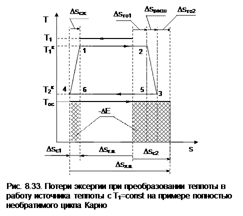 Внешняя необратимость за счет ΔT1 приводит к увеличению энтропии системы на величину DSто1. Внутренняя необратимость увеличивает изменение энтропии системы на величины DSрасш и DSсж, что соответствует разности энтропий отрезков 34 и 12. Внешняя необратимость ΔT2 приводит к увеличению энтропии системы на величину DSто2. Другими словами, увеличение энтропии холодного источника теплоты ΔSх.и по сравнению с горячим источником теплоты ΔSг.и обусловлено внешней необратимостью (ΔT1), внутренней необратимостью адиабатных процессов расширения и сжатия и внешней необратимостью (ΔT2). В итоге имеем увеличение энтропии нашей системы в виде разности энтропий горячего и холодного источников теплоты, соответствующей величине ΔSc = ΔSг.и+ ΔSх.и = ΔSc1+ ΔSc2. Потери максимально полезной работы – эксергии – -ΔE нашего источника теплоты будут определяться разностью работ обратимого цикла Карно и полностью необратимого цикла Карно 12341. В соответствии с теоремой Гюи–Стодолы эти потери работы на рис.8.33 равны сумме заштрихованных площадей. -ΔE = Tос ΔSС. Необходимо отметить, что не вся теплота трения адиабатных процессов расширения и сжатия теряется. Она усваивается рабочим телом, повышая его работоспособность, что проявляется в увеличении работы цикла 12341 по сравнению с работой цикла 12561, в котором отсутствует внутренняя необратимость. Теплота трения адиабатных процессов расширения и сжатия рабочего тела соответствует площадям под процессами 23 и 41 в T,S- диаграмме. Часть этой теплоты трения, соответствующей сумме площадей треугольников 2352 и 1641, преобразуется в работу цикла, а остальная часть передается внешней среде, что и приводит к увеличению энтропии системы за счет внутренней необратимости. Для оценки полезного использования теплоты трения во внутренне необратимых циклах вводится понятие коэффициента возврата потерь теплоты трения. Это отношение той части теплоты трения, которая используется для получения работы в цикле, к теоретической работе данного внутренне обратимого цикла. Для нашего примера он определяется отношением площадей (см. рис.8.33):