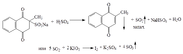 При последующем добавлении железа (III) хлорида происходит окисление 4-метиламиноантипирина – появляется темно-красное окрашивание. Менадиона натрия бисульфит в этих условиях образуют диоксид серы, который доказывают по запаху или по реакции с калия йодатом: К реакциям десульфирования относится реакция доказательства ковалентно связанной серы. Например, для обнаружения сульфамидной серы лекарственное средство (стрептоцид и др. сульфаниламиды) подвергают минерализации кипячением с концентрированной азотной кислотой, при этом ковалентно связанная сера переходит в сульфат-ион, который доказывают по реакции с раствором бария хлорида. HCl