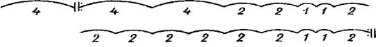 2 4 4 1 1 2 1 1 2 1 1 2 Участники упражнения становятся в одну шеренгу, лицом к преподавателю, и рассчитываются по порядку номеров. На вступление (2 такта) стоят на месте. Дальше каждый из участников, начиная с первого номера, последовательно идет четвертями вперед на одну музыкальную фразу, т. е. 1-й на первую фразу (4такта); 2-й на вторую фразу (4 такта); 3-й на третью фразу (1 такт) и т. д. Затем движение переходит опять к номеру первому, но теперь двигаются все последовательно в обратном направлении (т. е. делают шаги назад). Желательно, чтобы в этом упражнении число участников не соответствовало числу музыкальных фраз, чтобы каждому приходилось выполнять фразы разной длины. (При желании это упражнение можно сопровождать пением.) Упражнение 2-е «Марш советской молодежи» — музыка С. Туликова. (Музыкальное приложение № 2.) Разобрав музыкальное строение песни, определить ее фразировку. Энергично и жизнерадостно (рис. 2).