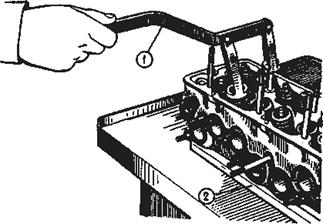 Рис. 23. Снятие пружин клапанов: 1 - приспособление A.60311/R; 2 - подставка