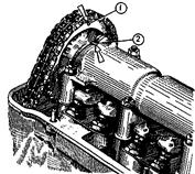Рис. 40. Проверка совпадения установочной метки на звездочке распределительного вала с меткой на корпусе подшипников: 1 - метка па звездочке; 2 - метка на корпусе подшипников