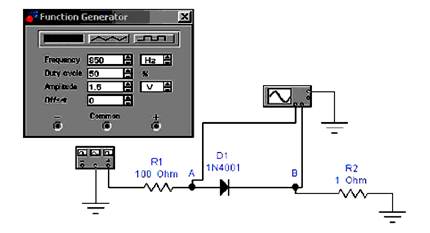 Вольтамперная характеристика может быть получена путем измерения напряжений на диоде при протекании различных токов за счет изменения напряжения источника питания Vs. Схема для исследования ВАХ диода с помощью осциллографа показана на рисунке 1.4.