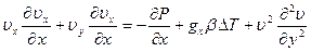Естественная конвекция вблизи твердой стенки в большом объеме обладает свойствами пограничного слоя. Однако поле скорости непосредственно связано с распределением температуры. Рассмотрим ламинарное течение в пристенном слое вблизи нагретой вертикальной пластины в неограниченном пространстве. Уравнения пограничного слоя для стационарных свободноконвективных течений имеет вид: - уравнение неразрывности