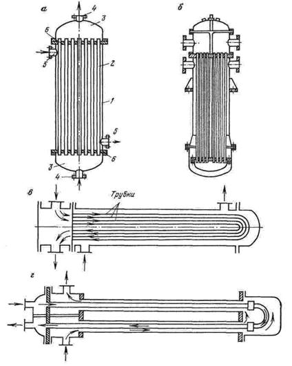 Рис.1.2. Основные виды рекуперативных теплообменных аппаратов: а – кожухотрубный теплообменный аппарат жесткой конструкции; 1 – цилиндрический кожух; 2 –трубный пучок; 3 – крышки; 4, 5 – штуцеры; 6 – трубные решетки; б – теплообменный аппарат с плавающей головкой; в – теплообменный аппарат с U-образными трубками; г – теплообменный аппарат типа «труба в трубе» Наиболее широко распространены в настоящее время кожухотрубные теплообменники, относящиеся к группе рекуператоров. По некоторым данным они составляют до 80% от всей теплообменной аппаратуры. Большое распространение получили теплообменные аппараты жесткой конструкции, теплообменники с компенсаторами температурных напряжений (с линзовыми компенсаторами на корпусе, с плавающей головкой), с U-образными трубками. Кроме того, в нефтяной и газовой промышленности широкое применение получили теплообменные аппараты типа «труба в трубе» (рис.1.2) и все шире применяются пластинчатые аппараты разборные, неразборные и полуразборные. В поверхностных теплообменных аппаратах горячий и холодный теплоносители могут двигаться различно. Наиболее простыми и распространенными схемами движения являются прямоток, противоток и перекрестный ток (рис.1.3). При прямотоке горячая и холодная среды движутся вдоль поверхности теплообмена в одном направлении, при противотоке – в противоположных направлениях, при перекрестном токе – в перекрещивающихся направлениях. Существуют аппараты и с более сложными схемами движения.