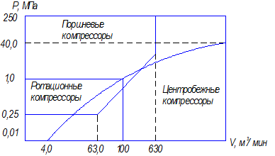 Рис. 2.32. Области применения компрессоров в зависимости от давлений и производительности