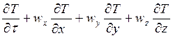 Левая часть этого уравнения представляет локальное изменение температуры элемента, выделенного в неподвижной среде. При конвективном теплообмене элемент перемещается из одной точки пространства в другую. В этом случае изменение температуры элемента может быть выражено при помощи субстациональной производной, учитывающей одновременно изменения параметра во времени и в пространстве, связанные с перемещением элемента из одной точки в другую. Субстанциональная производная, характеризующая полное изменение температуры движущего элемента, может быть записана в следующем виде: