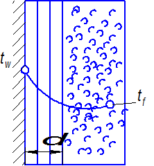 Для полного математического описания это уравнение должно быть дополнено уравнением, характеризующим условия на границе раздела движущейся среды и твердого тела. У поверхности твердого тела, находящегося в движущейся среде, всегда имеется пограничный слой толщиной Количество переданного через этот слой тепла при его распространении от теплообменной поверхности к ядру жидкостного потока можно определить по закону Фурье: