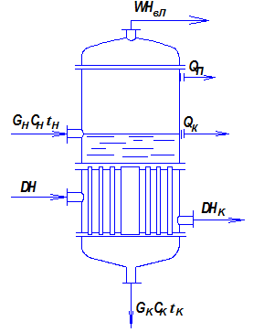 Из полученного равенства следует, что пар в процессе выпаривания расходуется на нагрев раствора до температуры кипения, образования вторичных паров, компенсации потерь тепла с концентрированием нелетучего компонента и потерь в окружающую среду. Поверхность нагрева выпарного аппарата определяется по основному уравнению теплопередачи