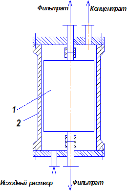 К недостаткам аппаратов с трубчатыми фильтрующими элементами следует отнести более сложный монтаж трубчатых элементов, чем у «фильтр-прессов», и невысокую удельную поверхность мембран, равную 60-200 м2/м3. Аппараты со спиральными фильтрующими элементами имеют более высокую, чем предыдущие, плотность упаковки мембран, достигающей 300-800 м2/м3. Высокая удельная поверхность мембран в таких аппаратах достигается за счет спиральных фильтрующих элементов в виде рулонов 1 (рис.4.48), помещаемых в трубе или в цилиндрическом корпусе 2 высокого давления.