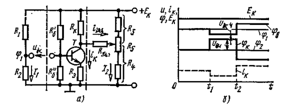 1-сурет Кіріске сигнал берген кезде кіріс тізбегінде ток пайда болады, транзистордың базасы мен коллекторының токтары өзгереді, нәтижесінде коллектордың кернеуі өзгеріп, Төмендегі 2-суретте кіріс және байланыс тізбектеріне СТ1, СТ2 стабилитрондар қосылған ТТК-нің сұлбасы және потенциалдық диграммасы көрсетілген. Мұндағы стабилитрондардың