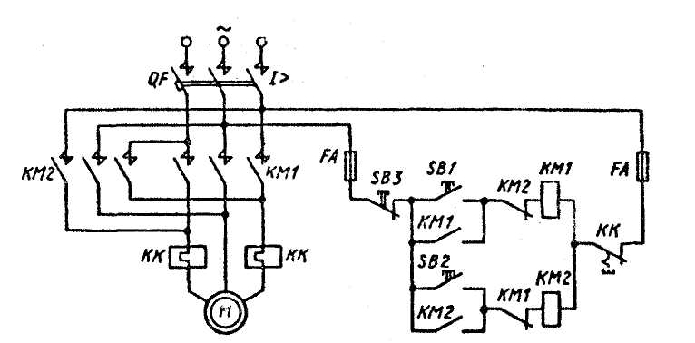 Схема обеспечивает: дистанционный пуск, реверсирование и останов, защиту двигателя от перегрузки, защиту от самозапуска. МП состоит из двух контакторов переменного тока КМ1 и КМ2 с главными и вспомогательными контактами (блок-контактами) и тепловыми реле КК с размыкающим контактом. Сведения о МП приведены в главе 9. Для пуска двигателя оператор нажимает на кнопку SB1,nu6o SB2. Катушка КМ1 (либо КМ2) получает питание, контактор срабатывает, включая контакты в цепи статора и блокирует пусковую кнопку. Двигатель разгоняется. При перегрузке (если ток статора длительно превышает 1,1 — 1,2 номинального значения) срабатывают тепловые реле КК, отключая своим контактом цепь питания катушки. В МП предусмотрена электрическая блокировка от одновременного включения контакторов. Для остановки оператор нажимает на кнопку SB3 (Стоп). Для защиты от коротких замыканий используется автоматический выключатель OF с электродинамическим расцепителем.