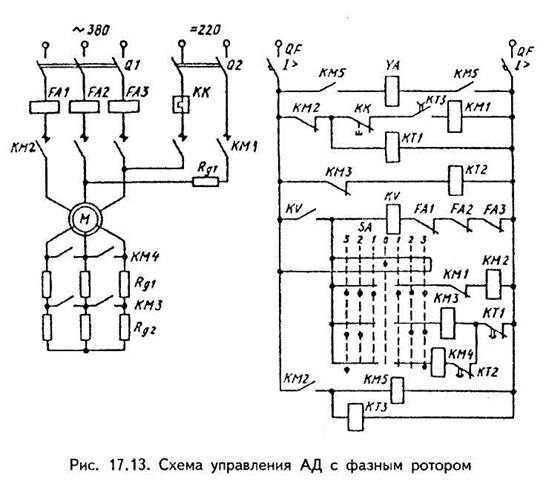 Схема включает АД с фазным ротором, типовую панель управления серии ПДУ6220, пускорегулирующие реостаты Rd1, Rd2, реостат динамического торможения Rdm, а также командоаппарат SА (рис. 17.13). Схема обеспечивает пуск АД в две ступени в функции независимой выдержки времени, автоматическое динамическое