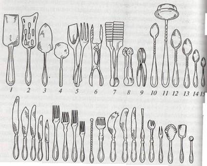 16 17 181920 21 22 23 24 25 26 27 28 29 30 31 32 33 34 35 Рис. 5.3. Столовые приборы: / — лопатка для перекладывания мучных кондитерских изделий; 2, 3 — лопатки для перекладывания; 4 — лопатка десертная; 5 — прибор для переклады на для вторых блюд; 6—9 — щипцы для кондитерских изделий, орехов, сахари; 10 — ложка для приготовления коктейлей; 11 — разливательная ложка; 12\ 15 — ложки: столовая, десертная, чайная, кофейная; 16—20 — ножи: столовый, рыбный, закусочный, десертный, фруктовый; 21—24 — вилки: столовая, рыбная, закусочная, десертная; 25 — вертушка для шампанского; 26 — вилки шпротная; 27—29 — ножи: для сыра, масла, лимона; 30 — вилка для разделки крабов; 31 — вилка для устриц; 32 — вилка для лимона; 33 — ложка для варенья 34 — лопатка для паштетов; 35 — ложка для специй