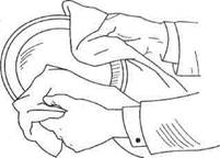 • рюмки и бокалы держат через край ручника левой рукой за ножку, а правой протираю! другим концом ручника так, чтобы большим пальцем шлифовать внутреннюю часть рюмки, а остальными — наружную; • узкие бокалы протирают особенно осторожно, проталкивая внутрь конец ручника и проворачивая его там.