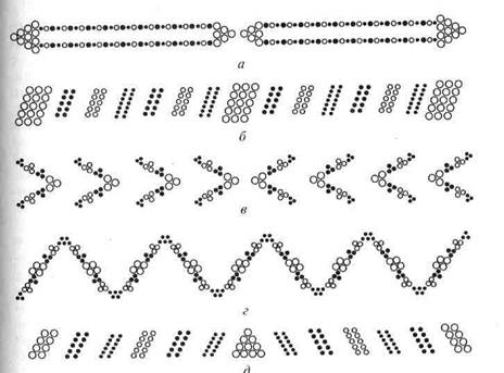 Рис. 14.9. Варианты расстановки посуды из стекла для банкета-фуршета: а — в два ряда; б, д — группами; в — «елочкой»; г — «змейкой» Предметы сервировки, напитки, фрукты и закуски заранее ставят на стол. Начинают сервировку фуршетного стола с расстановки стеклянной или хрустальной посуды (рис. 14.9). Как правило, стол сервируют с двух сторон (двусторонняя сервировка). Исключение составляет стол для почетных гостей (односторонняя сервировка). Столы, расположенные у стен, сервируют также только с одной стороны. Разнообразят сервировку стола различными способами расстановки стеклянных (хрустальных) бокалов, рюмок, фужеров. При расстановке в два ряда на конце стола ставят фужеры в виде треугольника по 10 — 15 шт. вершиной к торцу. Концы стола на расстоянии 15 —20 см должны быть свободными. Между группами фужеров ставят, чередуя в определенном порядке, рюмки на расстоянии 1,0 — 1,5 см друг от друга (водочную, лафитную, рейнвейную и т.д.). Ряды рюмок должны быть на одинаковом расстоянии от оси стола (10 — 15 см), следовательно, между рядами рюмок расстояние должно быть 20 — 30 см. Чередование рюмок в рядах должно быть симметричным. Ряды рюмок выравнивают. Вазы с цветами и фруктами, бутылки с напитками ставят по оси стола между рядами рюмок. Бутылки с пивом, минеральной и фруктовой водой, квасом — около групп фужеров. Если в меню предусмотрены соки, стаканы для них ставят рядом с фужерами и там же размещают кувшины; стаканы можно ставить в ряды с рюмками, также чередуя их в определенной последовательности. Бутылки со спиртными напитками расставляют с одинаковыми интервалами, этикетками в сторону гостей. При расстановке «змейкой» по оси стола ставят фужеры группами по 5—7 шт. на расстоянии 80—100 см. От фужеров под углом 45° к краям стола на одной линии располагают, чередуя по одной или по три, рюмки — лафитные, рейнвейные, водочные. Бутылки с напитками в этом случае ставят группами внутри образовавшихся из рюмок углов, а фрукты и цветы — по оси между группами фужеров. При расстановке «елочкой» по оси стола также группами ставят фужеры, а затем от каждой группы в виде незамкнутого треугольника распределяют группами или по одной различные рюмки. Расположение «елочкой» может быть в одну сторону на одном столе и в противоположную — на другом. Если стол один, то «елочку» располагают в противоположные стороны от центра к торцам. Вазы с фруктами, цветами и бутылки с напитками ставят по оси стола. Бутылки можно расположить группами или по одной с равными интервалами. При расстановке группами фужеры и рюмки ставят вдоль стола по 15—18 шт. и более под углом к оси 30 — 45°, чередуя их по видам. Расстояние между группами различных рюмок должно быть 30—50 см. Между ними устанавливают вазы с цветами и фруктами, бутылки с напитками. Расстановку различных видов рюмок, бокалов, фужеров выполняют заранее в соответствии с их расчетным количеством. Фужеров должно быть всегда больше, чем каждого вида рюмок. После расстановки фужеров и рюмок на фуршетный стол ставят стопками (по 6 — 8 шт.) закусочные и за ними десертные тарелки. Стопки. закусочных тарелок размещают на расстоянии 2 см от края стола и 0,7—1 м от торца. Стопки тарелок по обеим сторонам располагают симметрично через каждые 1,5—2 м, за исключением сервировки стола «змейкой». Затем стол сервируют приборами (рис. 14.10). Их располагают г