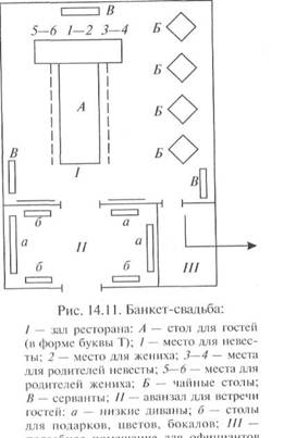 повторяют через четыре-пять мест. По оси стола через равные интервалы устанавливают вазы с фруктами. Закуски в салатниках расставляют ближе к середине стола, а в блюдах с низкими бортами — ближе к предметам сервировки; икорницы, салатники ставят на пирожковые или закусочные тарелки. Для сохранения качества и внешнего вида холодных закусок их ставят на стол за 30—40 мин до начала банкета. Бутылки с напитками ставят рядом с рюмками на одном уровне или в интервалах между группами рюмок. На узких столах бутылки ставят группами по 2—4 шт. по центру стола. Вина открывают на подсобном столе заранее, затем ставят на стол, прикрыв пробкой, бутылки с водой не открывают. Хлеб официанты раскладывают на пирожковые тарелки. Расстегаи можно положить на пирожковые тарелки рядом с хлебом или обнести ими гостей. Если оборудовано отдельное помещение для встречи и сбора гостей, то в нем устанавливают столы, на которые ставят вазы с цветами, пепельницы, кладут сигареты и спички, принесенные гостями подарки. Не надо ставить на стол сразу все закуски, напитки и блюда, включенные в меню свадебного банкета. Лучше по согласованию с заказчиком часть из них оставить на подсобном столе и подавать в процессе обслуживания по мере надобности. На стол перед приборами жениха и невесты ни закусок, ни напитков не ставят. Ставят лишь фужеры для воды и бокалы для шампанского. Встреча гостей. В момент встречи гостей с новобрачными рекомендуется подать шампанское. Для этого официанты на подсобном столе наполняют бокалы шампанским на 2/3 их объема, ставят на поднос небольшого размера и подают молодоженам и гостям. Шампанское может быть предложено не только во время встречи и сбора гостей, а непосредственно за свадебным столом. Его можно подать двумя способами. При первом способе бокалы, поставленные на подносы, наполняют шампанским перед приглашением гостей за стол и подают в обнос или расставляют бокалы с шампанским на столе; при этом один официант держит поднос, продвигаясь вдоль стола, другой берет бокалы и ставит их на стол перед каждым гостем. При втором способе бокалы ставят на стол при сервировке и по договоренности с устроителем банкета или его доверенным лицом перед тем, как пригласить гостей за стол, официанты наполняют бокалы шампанским. Бокалы для молодых и их родителей наполняют после того, как гости сядут за стол. Если шампанское подают и к десерту, бокалы оставляют на столе. Обслуживание гостей. За 5—10 мин до начала свадебного вечера метрдотель или официант сообщает устроителю свадьбы, что все подготовлено, и занимает место в зале, ожидая приглашения гостей к столу. Официанты с момента приглашения гостей к столу находятся в зале, встречают гостей, помогая им сесть за стол, а затем разливают напитки, раскладывают в тарелки закуски и т.д. Особое внимание должно быть уделено молодоженам и их родителям. Все блюда, напитки им предлагают и подают официанты в обнос. По мере необходимости официанты заменяют тарелки и приборы, убирают освободившуюся от закусок и напитков посуду. Спустя некоторое время с момента начала банкета может быть сделан перерыв на 30—40 мин, чтобы потанцевать, покурить и т.д. В зале для танцев надо поставить столы с пепельницами, стулья, а также поставить бутылки с водой, фужеры и положить сигареты. Во время перерыва официанты приводят в пор