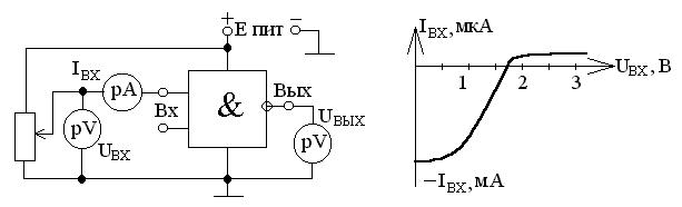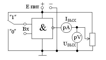 Характеристики снимаются в двух случаях: на вход ИМС подается напряжение логического ²0² (можно подать 0 В) и напряжение, соответствующее логической ²1² (5 В). В первом случае транзистор закрыт и при напряжении, которое подается на выход ИМС с потенциометра, равное 0 В, ток будет равен ЕПИТ/R3, ток вытекает, поэтому он отрицательный. При подаче напряжения равного 5 В выходной ток будет равен 0. Во втором случае, хотя транзистор открыт, он шунтируется милли -амперметром, и ток также будет равен ЕПИТ/R3. При увеличении напряжения, когда оно сравняется с напряжение насыщения транзистора (0,1 В) ток будет равен 0. При дальнейшем увеличении выходная характеристика ИМС будет повторять выходную характеристику транзистора. (Она показана пунктиром, так как мощность рассеивания на коллекторе превышает допустимую).