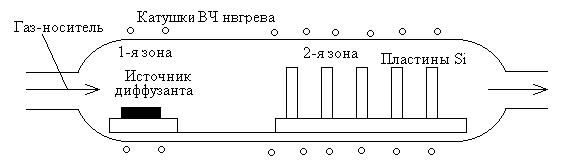 Следовательно, если проводится многократная диффузия, то для последней диффузии нужно выбирать материал с максимальной предельной растворимостью. Поскольку ассортимент примесных материалов ограничен, не удается обеспечить более 3-х последовательных диффузий. Примеси, вводимые путем диффузии, называют диффузантами (бор, фосфор и др.). Источниками диффузантов являются их химические соединения. Это могут быть жидкости (ВВr3, РОСl), твердые тела (В2О3, P2O5) или газы (В2Н6, РН3). Внедрение примесей обычно осуществляется с помощью газотран- спортных реакций - так же, как при эпитаксии и окислении. Для этого используются либо однозонные, либо двухзонные диффузионные печи. Двухзонные печи используются в случае твердых диффузантов. В таких печах (рисунок 3.5) имеются две высокотемпературные зоны, одна - для испарения источника диффузанта, вторая - собственно для диффузии.