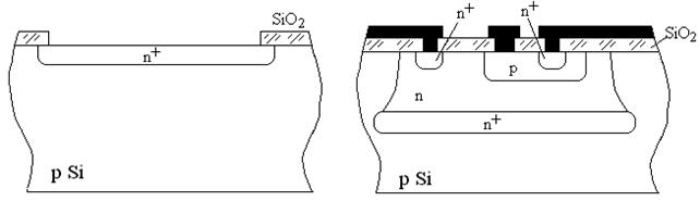 Первыми операциями при изготовлении таких микросхем являются термическое окисление, фотолитография и диффузия донорной примесью, чтобы создать n+ - слой на месте, где будут формироваться транзисторы (рисунок 4.8а). Толщина этого слоя составляет примерно 2 мкм. Затем слой SiO2 стравливается. В последующем проводится эпитаксия и последовательно все операции, которые использовались при изготовлении планарно–эпитаксиального транзистора. Структура готового транзистора приведена на рисунке 4.8б.